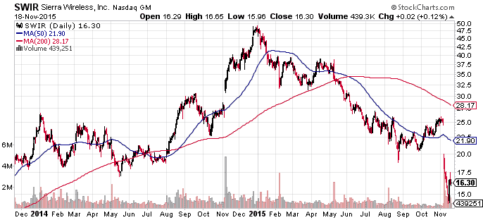 Was haben Intel (WKN: 855681), Qualcomm (WKN: 883121), Ericsson (WKN: 850001) und Cisco Systems (WKN: 878841) gemeinsam? Alle haben das „Internet der Dinge“ als Zukunftsmarkt auserkoren. Jeder der genannten könnte nun die anderen in diesem Wettrennen mit einem einzigen Zukauf überrunden – und müsste dafür nicht einmal tief in die Tasche greifen. Sierra Wireless (WKN: 920860), der Marktführer für M2M-Kommunikation, ist nach den letzten Zahlen abgestraft worden und nicht einmal mehr 500 Mio. US$ wert.