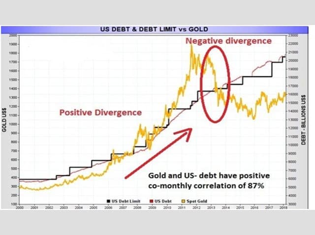 Der Goldpreis und die US-Staatsverschuldung weisen eine positive Korrelation von 87% auf. Dass die Entwicklung von 2011 bis 2015 umgekehrt war, lässt sich daraus ableiten, dass die Steigerung des Goldpreises infolge der Finanzkrise 2008 sehr steil verlief und dies Anleger ins Gold trieb, die aber später, aus Angst vor Verlusten, wieder ängstlich wurden und verkauften. Quelle: World Gold Charts