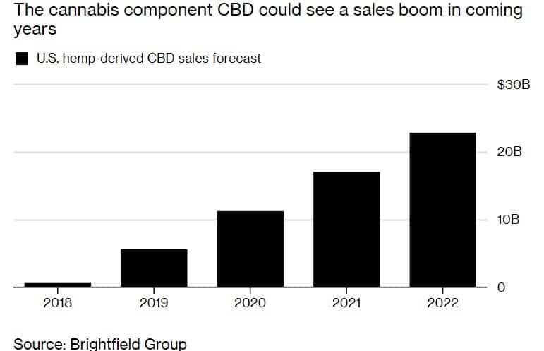 Neueste Schätzungen der Brightfield Group für den CBD-Markt reichen bis zu knapp 23 Milliarden US-Dollar im Jahr 2022 bei einem derzeitigen Marktvolumen von nicht einemal 600 Millionen US-Dollar (2018). Die neuen Zahlen (Stand Dezember 2018) sind bemerkenswert vor dem Hintergrund, dass Mitte 2018 die Prognosen noch deutlich tiefer anmuteten: