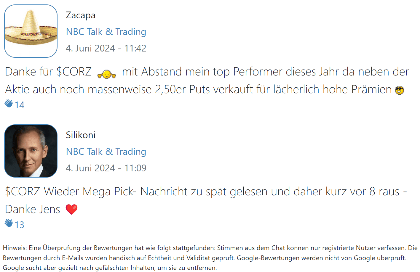 Fakt ist: Am Mittwoch erreichte Core zwischenzeitlich fast 8 US$ und ging mit einem Kurs von 7,15 US$ aus dem Handel. Das war also zum Empfehlungskurs eine grandiose Rendite von +70% binnen weniger Monate, für etliche NBC-Mitglieder war es sogar ein Verdoppler.