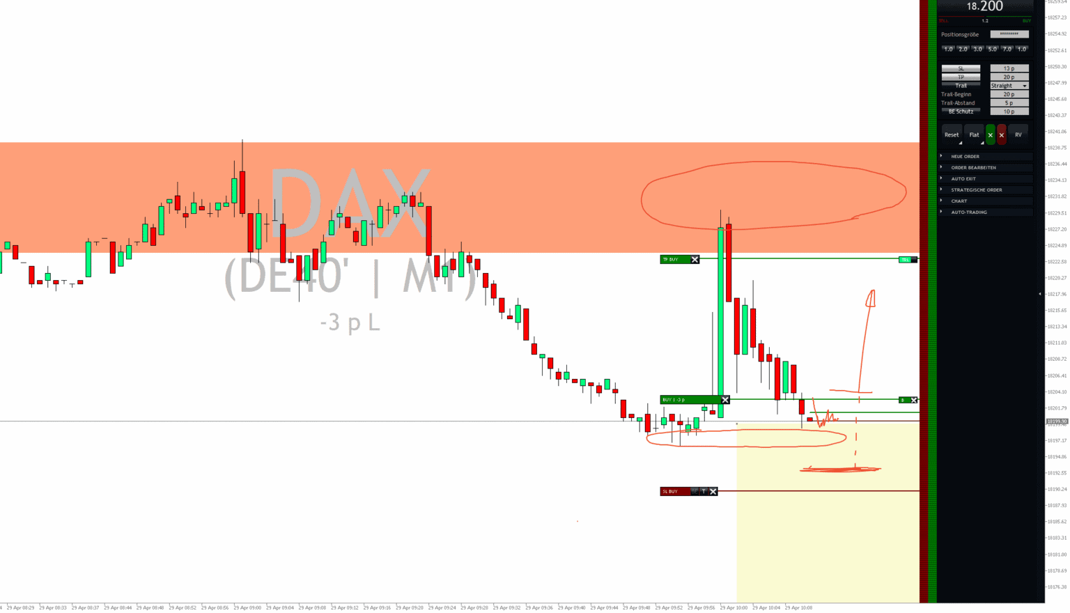 Daraufhin durchlief der Markt den Supportbereich bei 18.080/18.100 Punkten, woraufhin unser Profi-Trader sich an der Unterkante für eine weitere Long-Position entschied. Nach einem kurzen Run kippte der DAX aber wieder ab und holte erneut den Stopp.