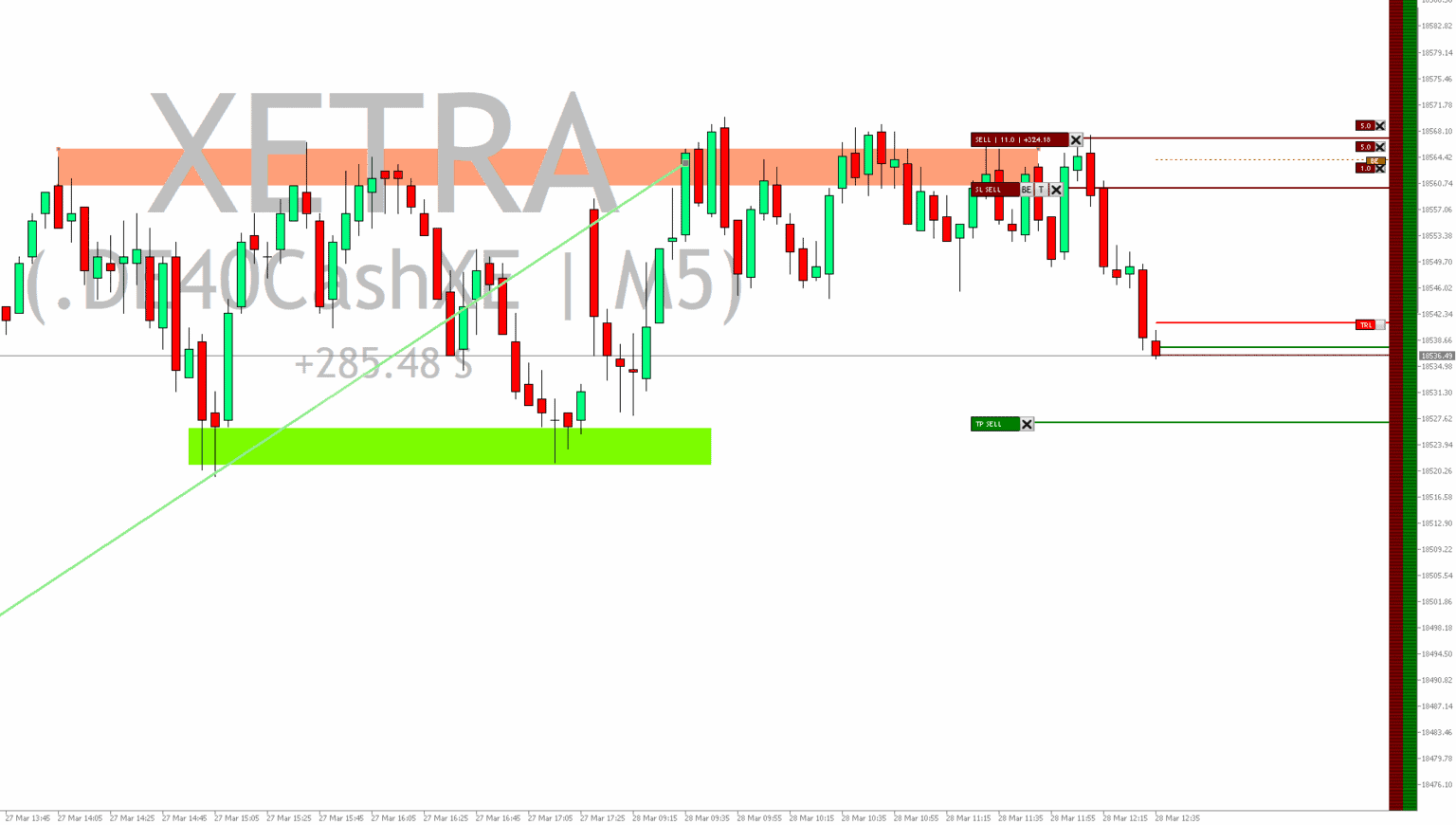 Zum Ende der verkürzten Handelswoche entschied sich Andreas Bernstein für das gleiche Setup wie am Montag und am Mittwoch. Die Idee war es, mit einer Short-Position im All Time High-Bereich zum Erfolg zu kommen. Die Position startete gut und lief mit 30 Punkten in den Gewinn. Daraufhin konnte der Stopp versetzt und der Gewinn gesichert werden.