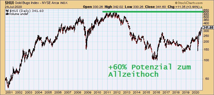 Trotzdem notiert der NYSE Arca Goldbugs Goldminen-Index (kurz HUI) bei zurzeit 340 Punkten noch deutlich unter seinem Allzeithoch von knapp 600 Punkten und besitzt von dieser Warte aus erhebliches Nachholpotenzial von mindestens +60% bis zum alten Hoch. Würde Gold über 2.500 USD ausbrechen, hätte das einen solchen Gewinnschub bei den Minen zur Folge, dass das Kursziel im HUI wohl eher bei +150% liegen müsste.