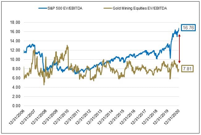 Wenn Sie jetzt die mitunter günstigsten Goldminenaktien erwerben, kaufen Sie profitable, renditestarke Unternehmen, die aktuell nur halb so teuer sind wie der Marktdurchschnitt, gemessen am S&P 500, der auf seine eklatanten Rekordbewertungen aus dem Jahr 2000 zusteuert.