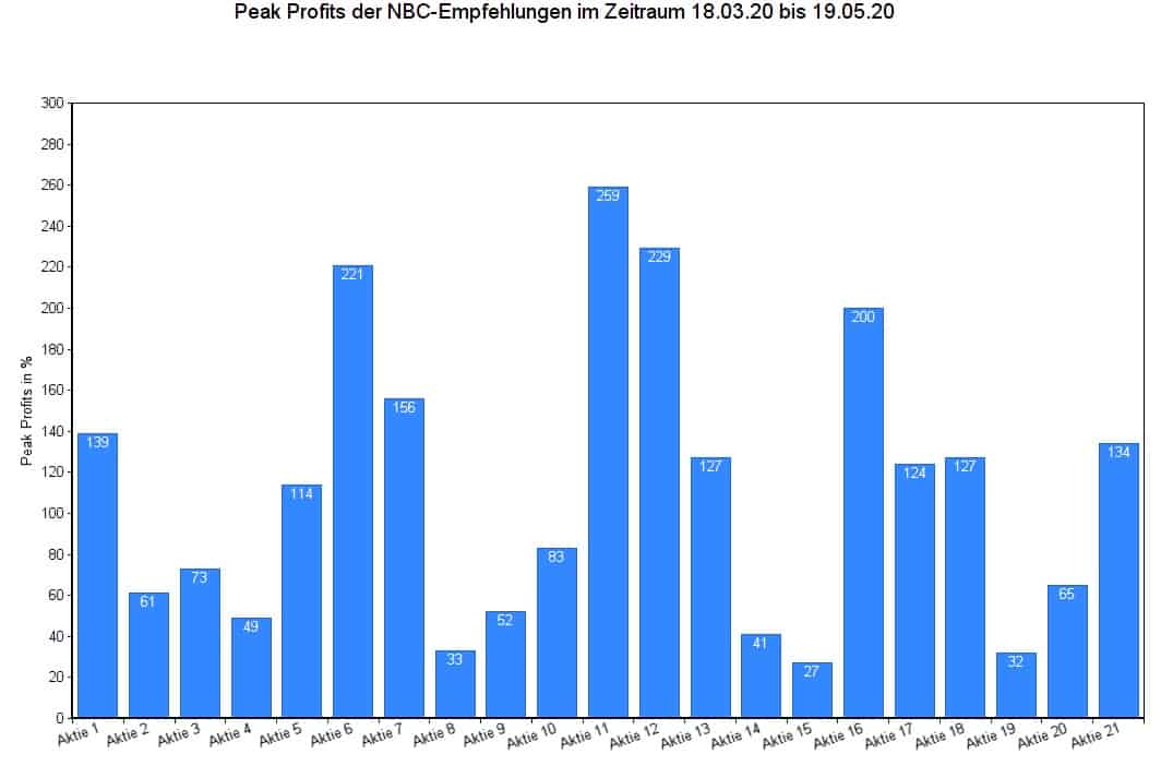 Die obige Grafik zeigt die "Peak Profits" aller NBC-Empfehlungen zwischen dem 18. März und dem 19. Mai dieses Jahres. Neben den 17 Titeln, die zu Beginn des Berichtzeitraums im Portfolio standen, wurden weitere vier Aktien ergänzt, die nach diesem Zeitpunkt als Neuempfehlung aufgenommen wurden. Basis der Performance-Berechnung sind die besten Einstiegskurse am 18. März beziehungsweise der nachfolgenden Empfehlungen sowie die realisierbaren Höchstpreise bis zum gestrigen Tage.