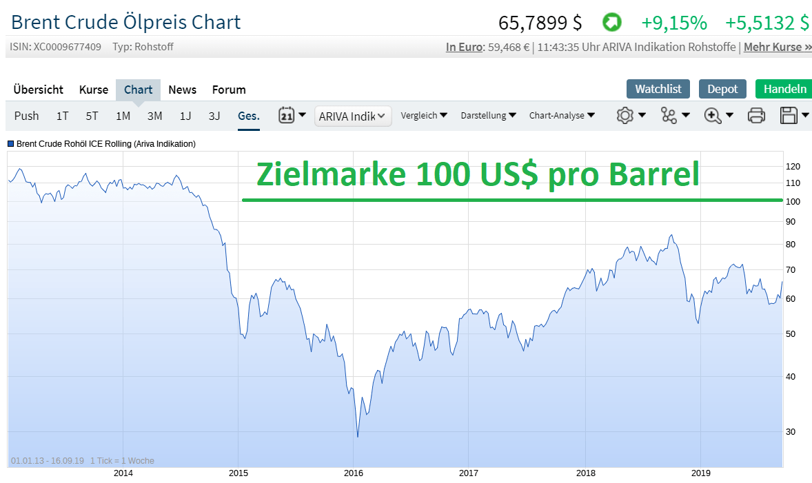 Wenn wir zurückblicken, so sind die Ölpreisbewegungen nach dem heftigen Einbruch vor drei Jahren von in der Spitze bei 110 US$ je Barrel im Jahr 2014 auf nahezu 30 US$ an Dramatik kaum zu überbieten gewesen. Danach setzte eine Erholung um rund 150% bis Herbst 2018 ein. Die Sorte Brent notierte schon wieder bei 85 US$, WTI hatte sich bis dahin mit 75 US$ gut verdoppelt. Quelle: Ariva.de