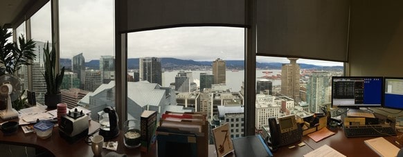 Broker-Arbeitsplatz bei Canaccord Genuity mit Blick auf Downtown Vancouver