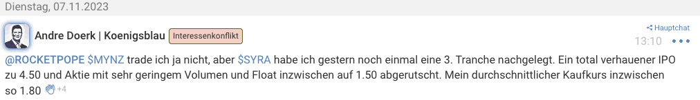 Schwarz auf Weiß: Der Beweis, dass Doerk die Syra-Explosion schon vor Wochen geahnt hat. Grafik: Ausschnitt aus dem Live Chat von sharedeals.de