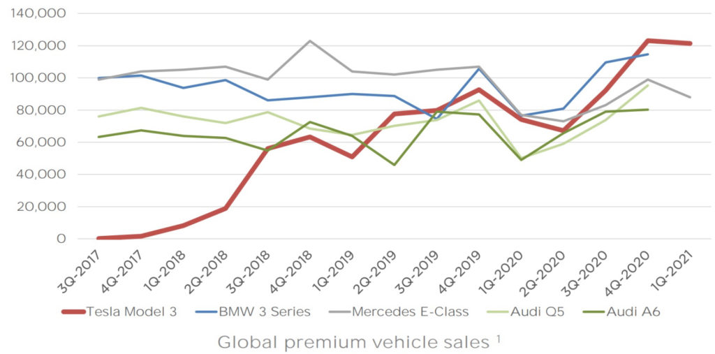 Geht es um den Spitzenplatz bei Premium-Limousinen hat das Model 3 den etablierten Modellen von BMW, Daimler & Audi längst den Rang abgelaufen. Gemäß dieser Tesla-Grafik ist das Model 3 die meistverkaufte Limousine der Welt (!) – vor dem 3er BMW, der E-Klasse sowie Audis A6.