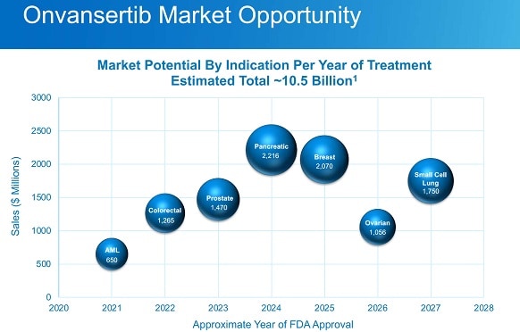 Unglaubliche 10,5 Milliarden Dollar Marktpotenzial wird dem Krebsmedikament Onvansertib von Trovagene (WKN: A2DN0J) indikationsübergreifend zugetraut. Eine erste Zulassung soll bereits 2021 erfolgen.