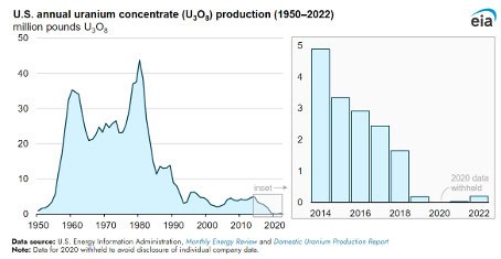 Doch die Situation wird noch brenzliger für die USA: Da die amerikanischen Versorger über Jahrzehnte günstiges Uran aus Russland und Kasachstan bezogen, brach die amerikanische Uranproduktion zusammen. Obwohl die USA nach China der zweitgrößte Verbraucher von Uran weltweit sind, macht der Anteil der USA am weltweit produzierten Uran nur 0,5 % aus!
