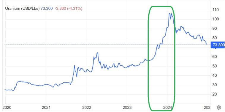 Das vergangene Jahr war ein Konsolidierungsjahr für die Uranaktien. Die Aktien kamen im Jahresverlauf zurück und wurden zum Jahresende im Rahmen der typischen steuerlichen Verlustverkäufe geradezu niedergemacht – obwohl sich die fundamentale Situation in den USA mit dem Einstieg von Big Tech in die Nuklearindustrie und dem Wahlsieg von Trump in 2024 massiv verbessert hat!