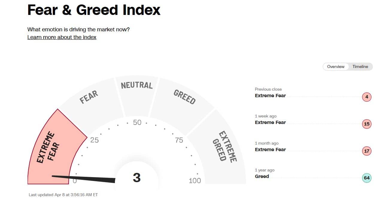 Der bekannte Fear & Greed Index befindet sich beinahe bis zum Anschlag im Bereich „extreme Angst“. Das war in der Vergangenheit immer ein guter Gradmesser dafür, dass ein Wendepunkt bevorsteht.