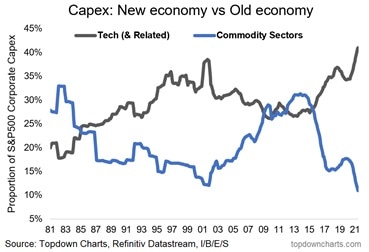 Die Investitionen von Rohstoffunternehmen im S&P 500 befinden sich auf einem Rekordtief im Vergleich zum Gesamtindex. Der Technologiesektor macht derzeit rund 40% der Investitionen im S&P 500 aus, so viel wie seit Jahrzehnten nicht mehr.