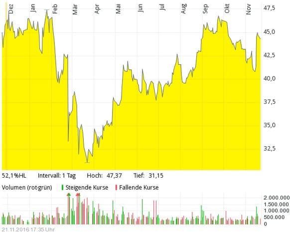 Die Stimmung bei den Wirecard-Aktionären ist wieder deutlich besser als zum Jahresbeginn und der Kurs steht kurz vor einem neuen Allzeithoch. Über 47 € wäre der Weg nach oben frei. Unterstützung erfährt die Aktie momentan von einer starken Prognose für das nächste Jahr, welche am 16.11. vorgelegt wurde. In 2017 erwartet Wirecard einen operativen Gewinn (EBITDA) zwischen 382 und 400 Mio. Euro.