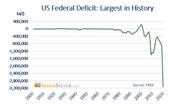2020 wurden von der US-Regierung insgesamt knapp 3,1 Billionen US-Dollar an COVID-Entlastungen zur Verfügung gestellt. Nun sieht die Prognose des US-Haushaltsdefizits für 2021 auch nicht gerade rosig aus. Die Experten rechnen mit rund 3,5 Billionen US-Dollar, die dieses Jahr aufgenommen werden müssen. Das Rekord-Konjunkturprogramm über 1,9 Billionen US-Dollar wurde bereits verabschiedet und Sleepy Joe hat kürzlich um weitere 2 Billionen US-Dollar für die Infrastruktur gebeten und umwirbt die Kongressabgeordneten mit Schmeicheleien und mehr.