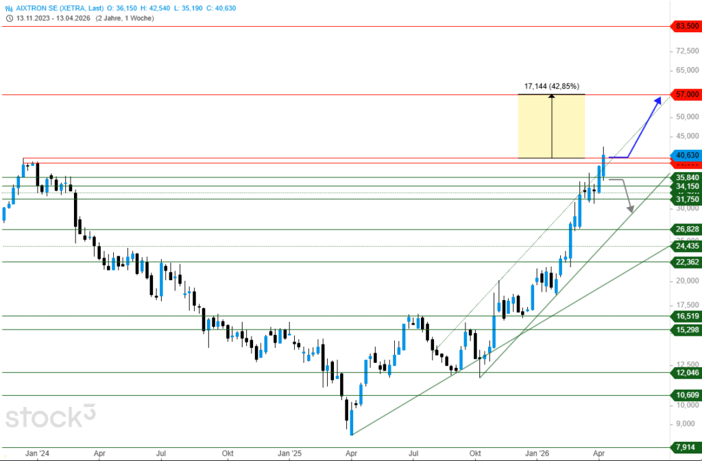 Die Anhebung der Prognose für 2026 sorgte für einen gestrigen Kursschub von in der Spitze +14%. Die Rally der Aixtron-Aktie hat somit seit dem Tief vom April 2025 mittlerweile >403% an Performance hervorgebracht. Mehr Details zur Anhebung der Prognose gibt es hier beim gestrigen Beitrag meines Kollegen Peter Wolf-Karnitschnig. Dabei attackiert die Aktie mittlerweile das Hoch vom Dezember 2023 bei 38,89 € und scheint noch immer nicht müde. Die Nachfrage nach den Papieren bleibt ungebrochen und daher erscheint eine Rally-Beschleunigung, trotz der bisherigen Zugewinne, ohne weiteres möglich.