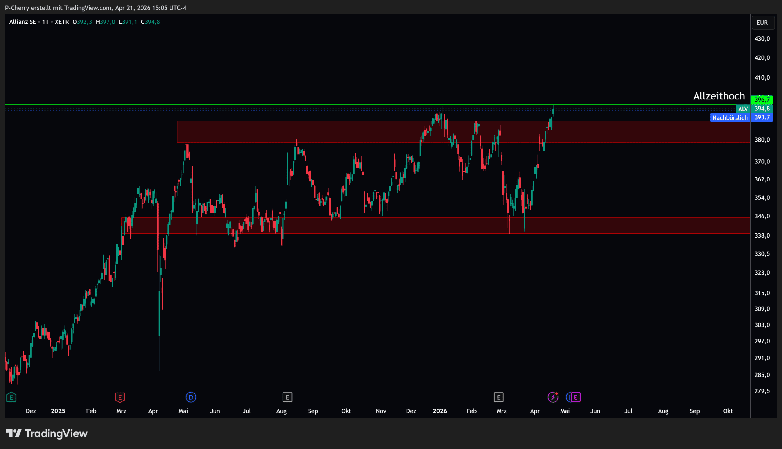 Der Kurs der Allianz-Aktie stieg gestern um +1,41% auf 394,80 € an. Damit hat diese ein neus Allzeithochs erreicht. Im unteren Unterstützungsbereich zwischen 339 € und 345,60 € fand der Kurs einen lokalen Boden und steigt seitdem dynamisch an.
