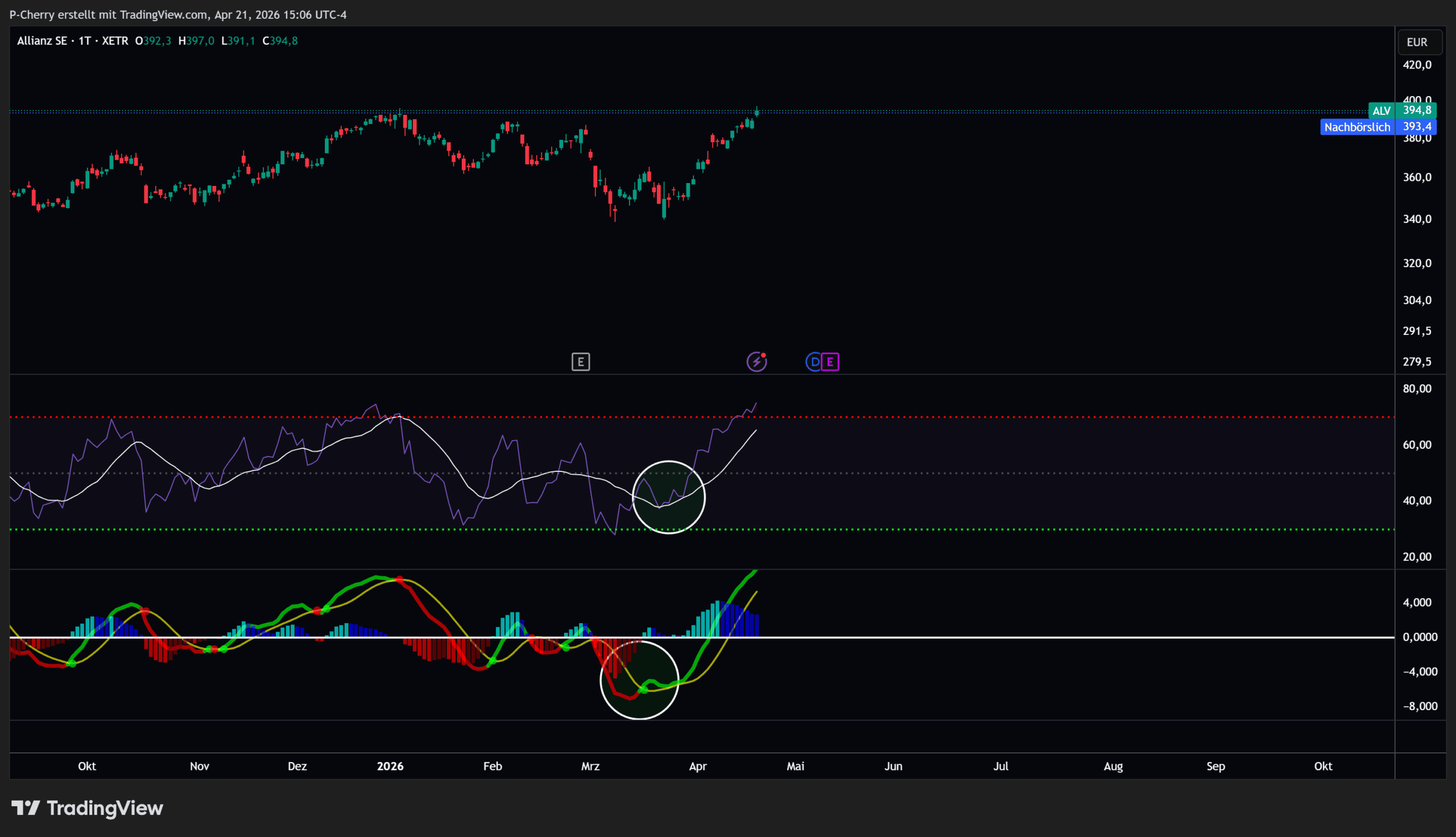 Die Indikatoren liefern weiterhin bullische Signale. RSI und MACD haben im Tages- wie auch im Wochenchart positive Crossovers gebildet, während das Momentum im Tageschart zuletzt etwas nachlässt. Kurzfristig bleibt die Allianz-Aktie damit stark, auch wenn der überkaufte RSI zur Vorsicht mahnt.