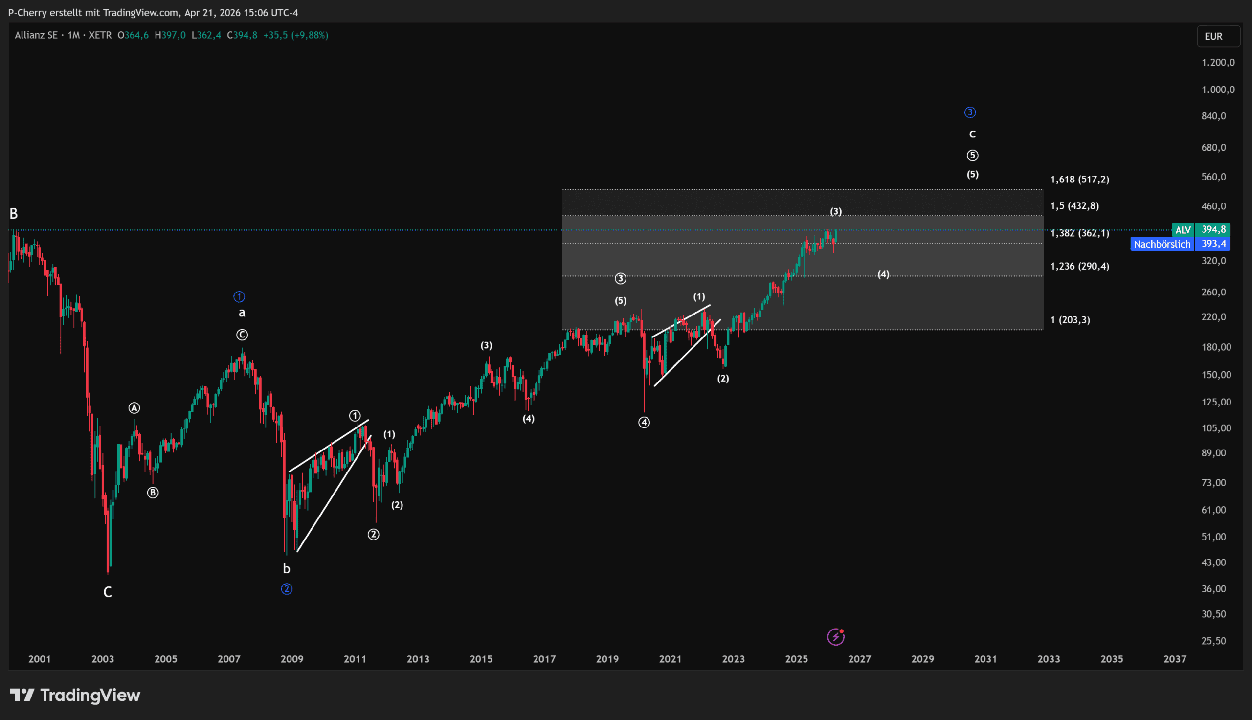 Entscheidend bleiben nun die Unterstützungen zwischen 378,60 € und 388,90 € sowie darunter der Bereich um 339 € bis 345,60 €. Die Elliott-Wellen deuten trotz möglicher weiterer Hochs auf eine fortgeschrittene Struktur hin, wodurch in den kommenden Monaten das Risiko einer größeren Korrektur steigt.