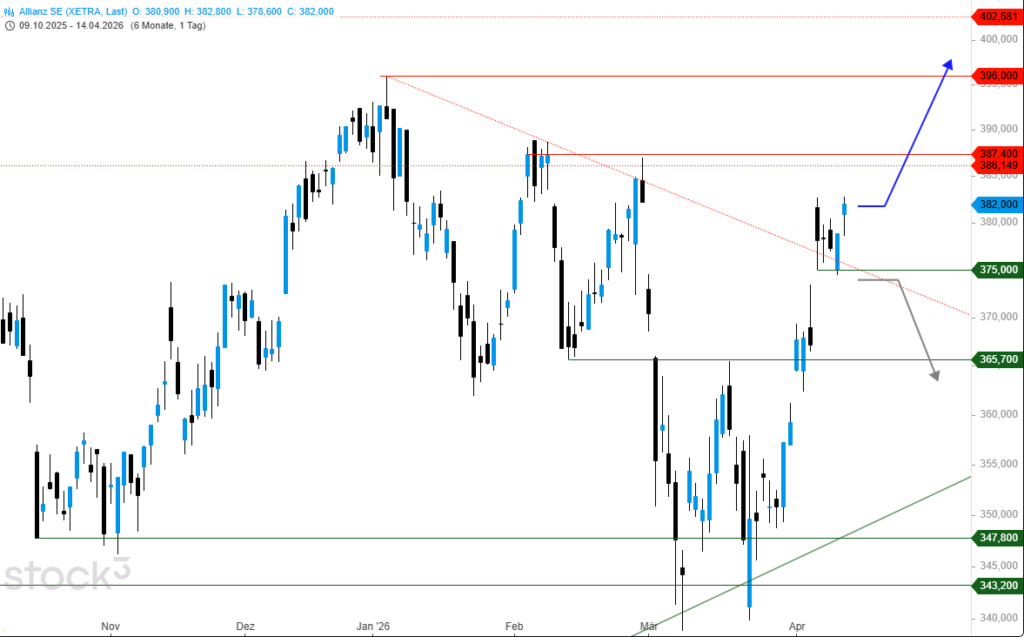 Der bereits Ende der vorangegangenen Woche gestartete Ausbruch bedarf einer dringenden Fortsetzung. Glücklicherweise konnte sich die Aktie bereits gestern fangen und mit einem Tagesgewinn schließen. Heute mit Vorfreude in den Handel gestartet, rückt die Widerstandszone von 386-387 € in den Blickpunkt.