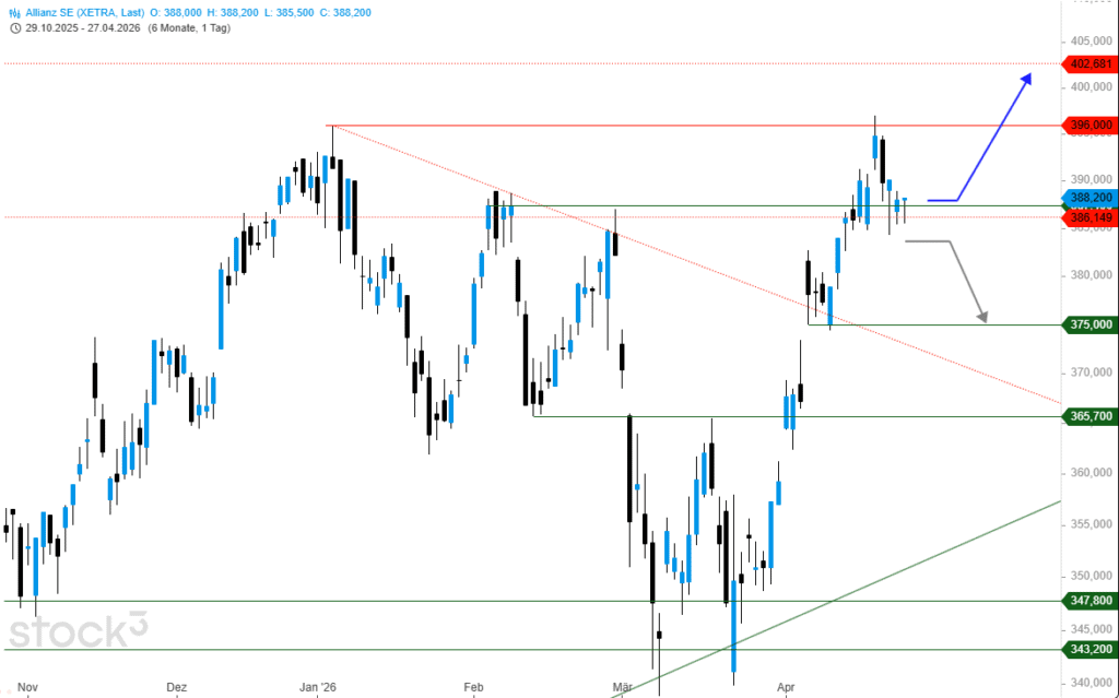 Trotz des marginal neuen Jahrzehntehochs setzten Gewinnmitnahmen ein und führten den Kurs der Aktie zurück bis zur vorherigen Widerstandszone von 386-387 €. Exakt hier besteht Pullback-Potenzial, sodass es nunmehr wieder aufwärtsgehen darf.