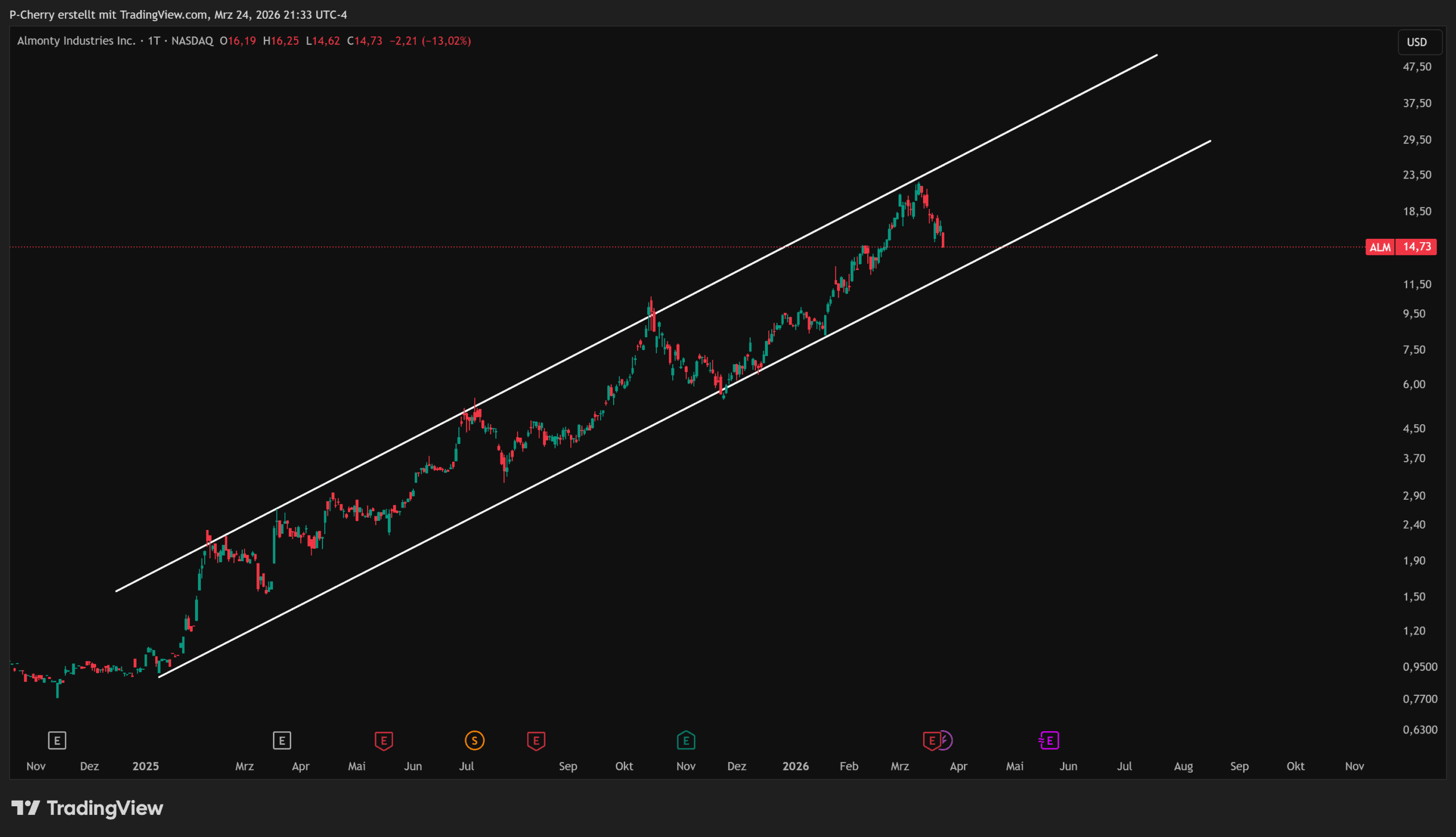 Der Kurs der Almonty-Aktie bewegt sich seit Anfang 2025 in einem aufsteigenden Trendkanal. Am 11. März hatte der Kurs die Oberkante des Trendkanals angetestet und damit ein neues Allzeithoch bei 22,55 US$ ausgebaut. Ein Rückfall zur Unterkante des besagten Trendkanals, aufgrund von Gewinnmitnahmen, wird daher immer wahrscheinlicher.