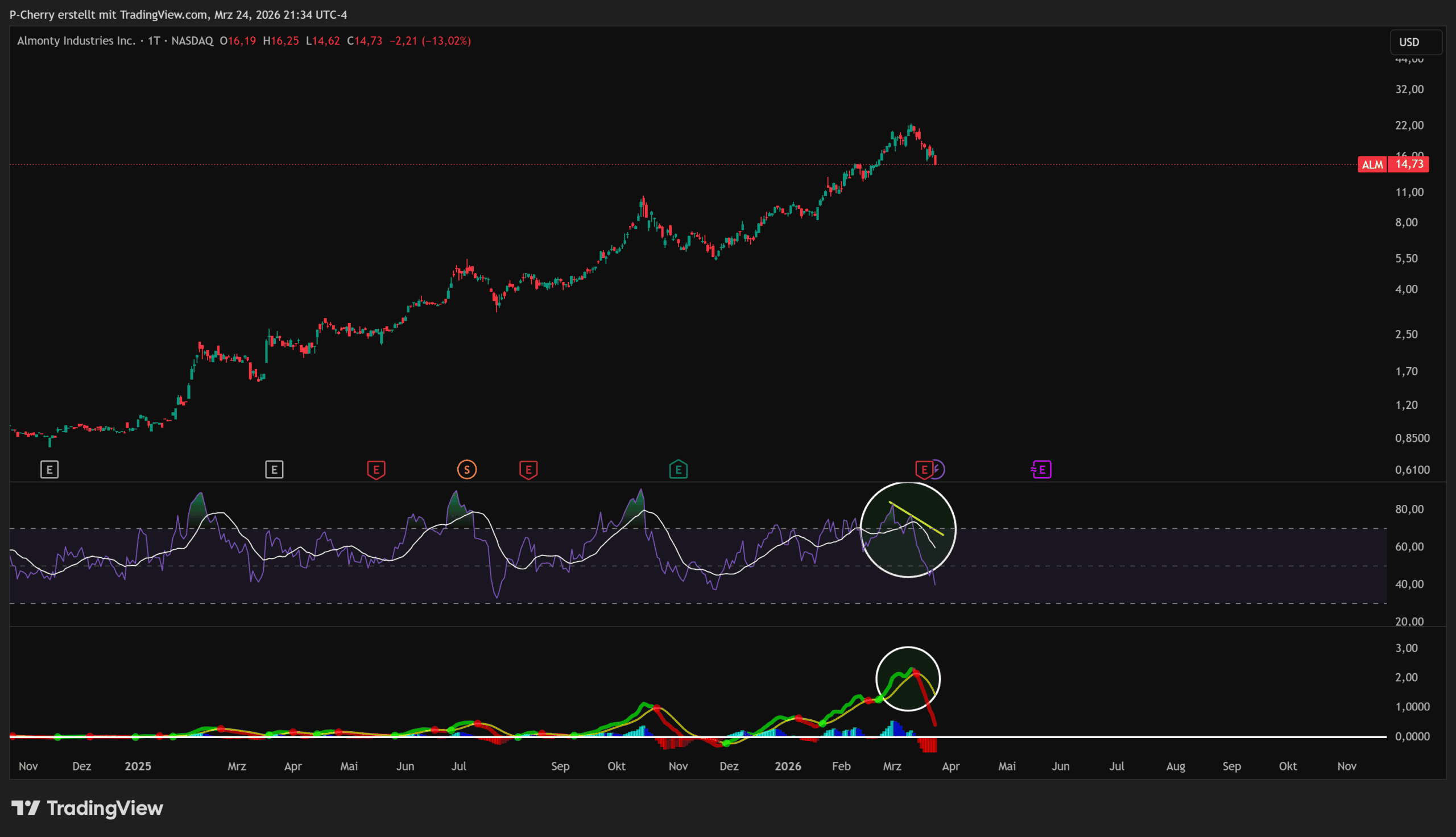 Der Almonty-Kurs verlor vom Allzeithoch bei 22,55 US$ am 11. März 2026 -34% an Wert, nachdem die Almonty-Aktie in den vergangenen Monaten stark gestiegen war. Zwischen September 2023 und dem 11. März 2026 konnte der Preis beeindruckende +4.722% zulegen. Doch der Almonty-Chart zeigt erste Schwächesignale.