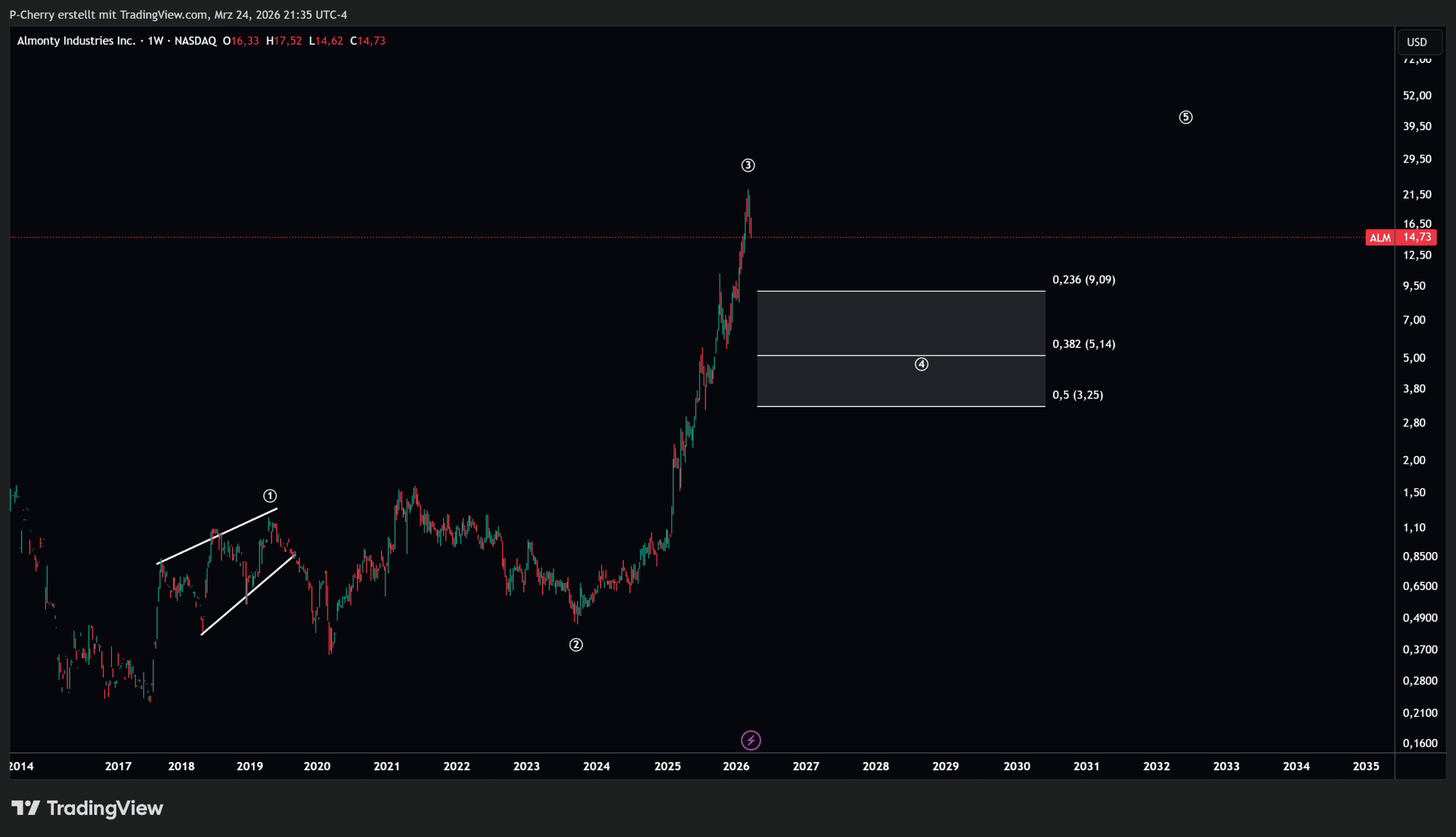 Die Elliott-Wellen-Analyse im Wochenchart zeigt, dass sich der Almonty-Kurs an einem möglichen Beginn eines größeren Rücksetzers befindet. Es ist eine dreiteilige Bewegung im Chart zu identifizieren, was auf einen Welle 4-Rücksetzer hindeutet. Der prognostizierte Trendwendebereich für die Welle 4 liegt zwischen dem 0,236er Fibonacci-Retracement bei 3,25 US$ und dem 0,5er Fibonacci-Retracement bei 9,09 US$.