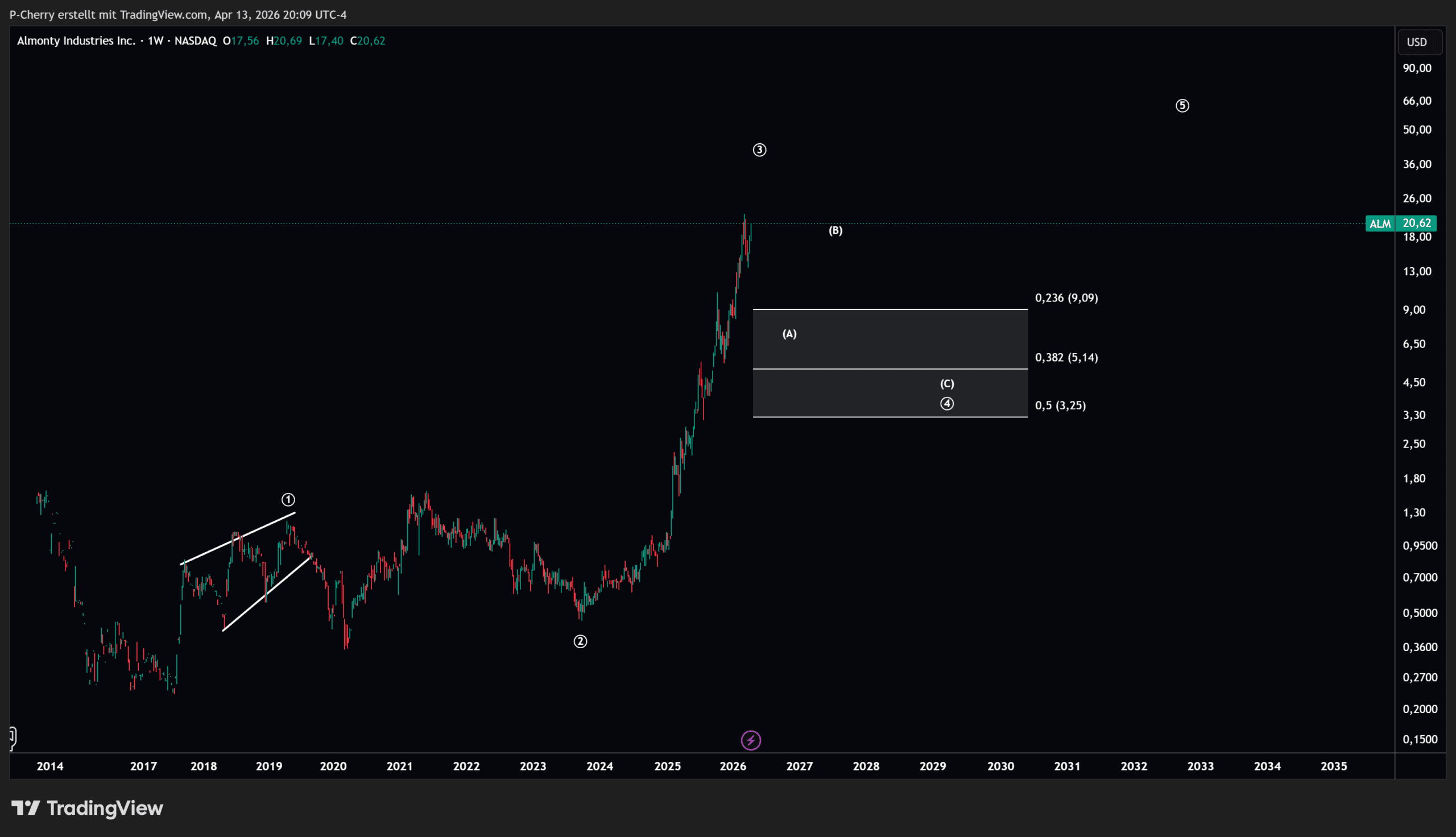 Die Elliott-Wellen-Analyse im Wochenchart zeigt, dass sich der Almonty-Kurs an einem möglichen Beginn eines größeren Rücksetzers in Form einer A-B-C-Korrektur befindet. Es ist eine vorangegangene, dreiteilige Bewegung im Chart zu identifizieren, was auf einen Welle 4-Rücksetzer hindeutet. Weitere Extensionen in der Welle 3 bleiben möglich und könnten zu einem neuen Allzeithoch führen.