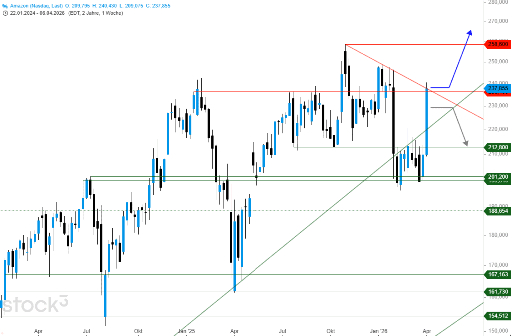 Neben dem dynamischen Sprung über den Widerstand von 212,80 US$ gelang es den Käufern im gleichen Atemzug während dieser Handelswoche, den weitaus höher liegenden Widerstand bei 236,40 US$ zu überwinden. Ein starkes Momentum, welches allerdings bisher nicht mit überzeugenden Umsätzen untermauert wird. Daher ist es wichtig, dass die Amazon-Aktie in der kommenden Woche das Level von 236,40 US$ verteidigen kann, um mitsamt Bruch der kurzfristigen Abwärtstrendlinie wieder in Richtung des Rekordstands vom November 2025 bei 258,60 US$ zu blicken. Dies idealerweise begleitet durch anziehende und stärkere Handelsumsätze als in den Vorwochen.