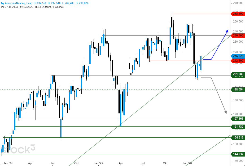 Die scharfen Rücksetzer zum Beginn des Februars konnte die Amazon-Aktie während der vergangenen Wochen gut relativieren. Mit dem Rückschlag zum Unterstützungslevel um 200 US$ beruhigte sich der Verkaufsdruck und seither glückte die Stabilisierung. Durch die Zugewinne im Mittwochshandel gelang dann schließlich auch die Rückkehr über den Widerstand von 212,80 US$. Fundamentale Gründe dafür finden sich auch hier im heutigen Artikel der Redaktion.