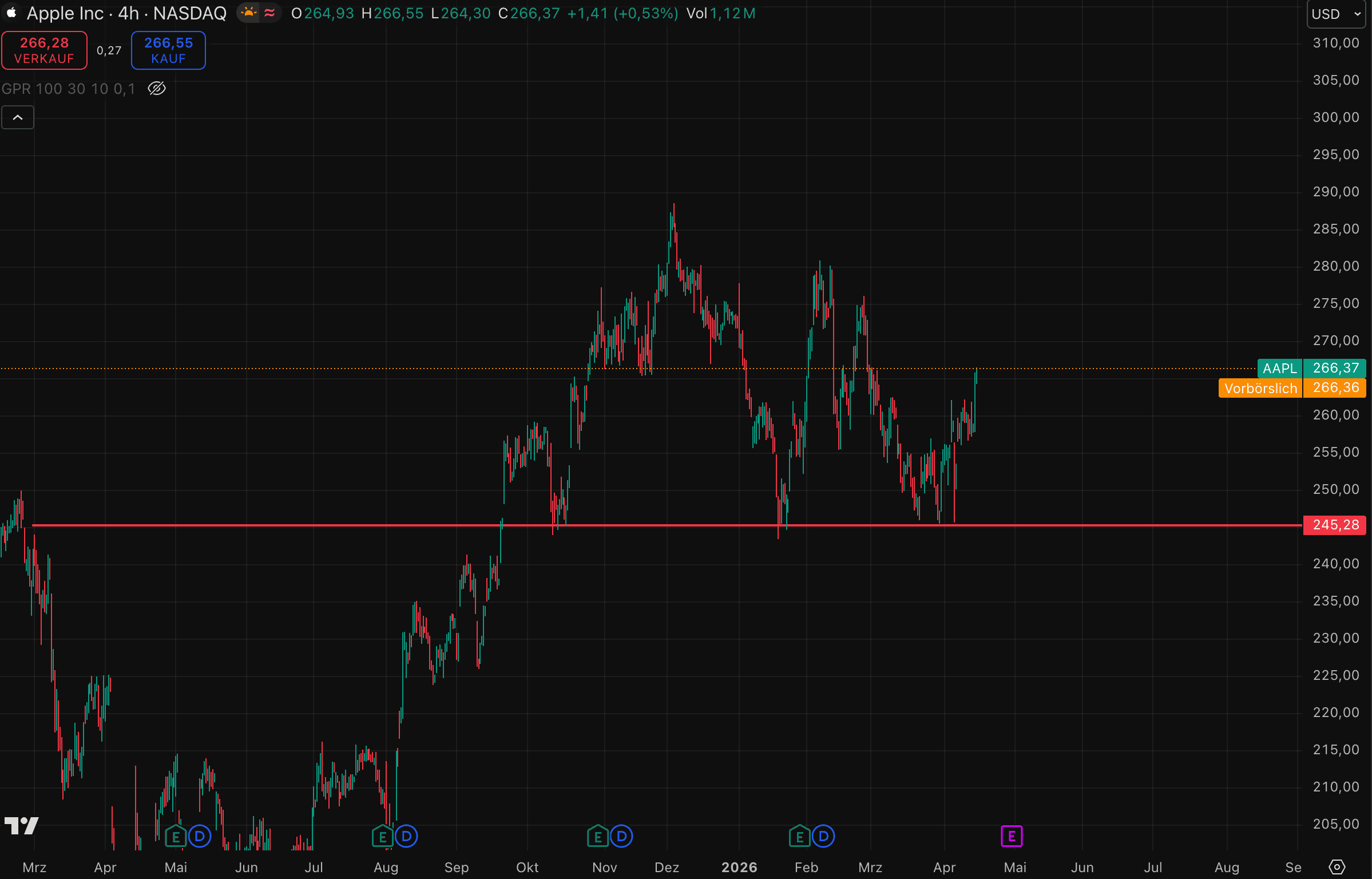 Die Aktie von Apple zeigt eine klare Gegenbewegung und notiert aktuell bei rund 266 US$. Zuvor wurde die Unterstützungszone im Bereich von 245 US$ erneut angelaufen, ein Niveau, das sich bereits mehrfach als relevant erwiesen hat.
