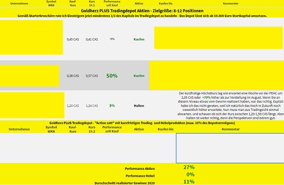 Das Goldherz PLUS Tradingdepot war zu Jahresanfang voll investiert und ich konnte bei rund einem Dutzend Positionen selbst 2020 noch im Schnitt +11% Gewinn realisieren und das sonst für 10 Werte vorgesehene Depot auf 3 Titel kürzen, so dass meine Leser sich nun mit 70% Liquiditätsquote auf die starken Rebound-Chancen fokussieren können, die ich jetzt erwarte. Praktisch täglich kann es soweit sein, dass ich meinen Lesern die besten Öl-Werte vorstelle, die jetzt ausgebombt sind und mindestens schnelle +100%-Rebound-Gewinne ermöglichen. Wenn Sie 2020 noch nicht positiv ins Börsenjahr starten konnten, haben Sie jetzt die seltene Gelegenheit und eine einmalige Chance, Ihre Verluste in Gewinne zu verwandeln.