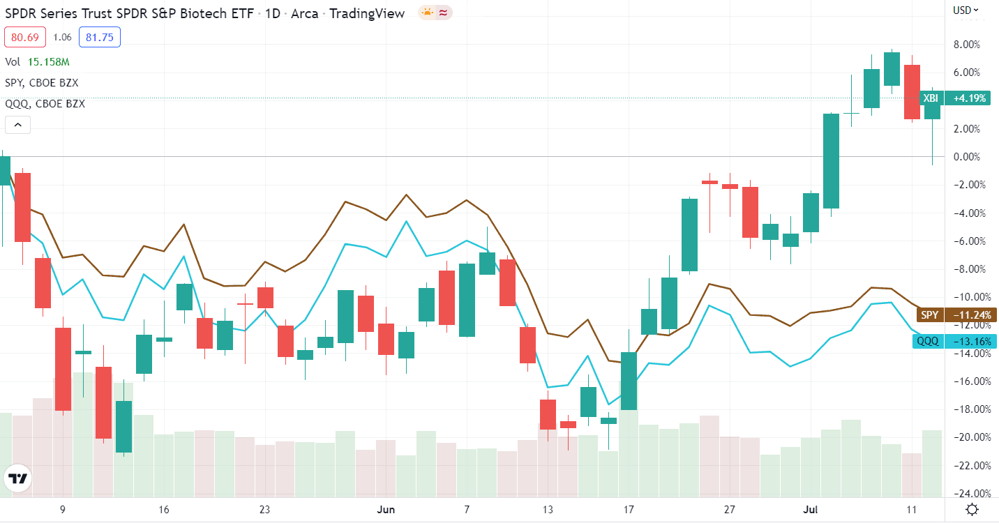 Insbesondere seit Mitte Juni kann der Biotech-ETF XBI massiv outperformen, obwohl die Branche normal als riskantes Marktsegment gilt. Für eine Schwächephase der breiten Märkte ist dieses Verhalten ungewöhnlich. Für mich ein deutliches Zeichen, dass Biotech-Investoren eine ordentliche Outperformance winkt, denn es gibt weiter viel aufzuholen.