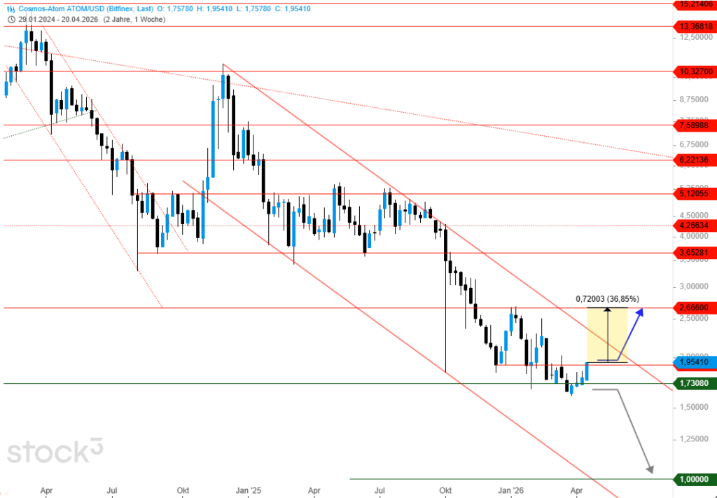 Mit Blick auf den Chart wird dabei ersichtlich, dass sich ATOM/USD nicht nur an den horizontalen Widerstand bei 1,92 US$ herangearbeitet hat, sondern zugleich auch die übergeordnete Abwärtstrendlinie vorausliegt. Genau dieses Zusammentreffen verleiht der aktuellen Lage ihren Reiz. Sollte der Ausbruch gelingen, dürfte dies den Startschuss für eine spürbar dynamischere Erholung liefern.