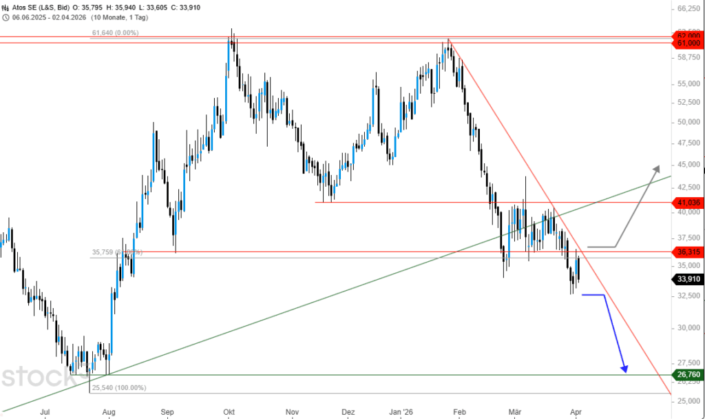 Sichtlich versucht hat es die Atos-Aktie den Aufwärtstrend seit 2025 zu halten. Stark umkämpft während der letzten Wochen bleibt, die sich mehr und mehr durchsetzende Schwäche allgegenwärtig und somit erscheint, einer Korrekturfortsetzung bis unter 30 € je Anteilsschein wahrscheinlich.