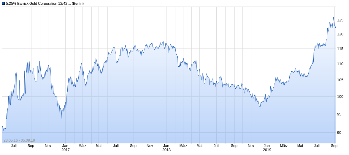 Die Zinsen der qualitativ guten Barrick Gold-Anleihe (WKN: A1G547), die immerhin einen satten 5,25% Kupon aufweist, werden zwar nicht direkt in Gold, sondern immer noch in US-Dollar ausbezahlt. Das schmälert ihre Attraktivität jedoch keineswegs. Wegen der langen Laufzeit bis 2042 bekommen Anleger momentan eine Rendite von 3,75% pro Jahr, wenn sie bis zum Ende der Laufzeit halten.
