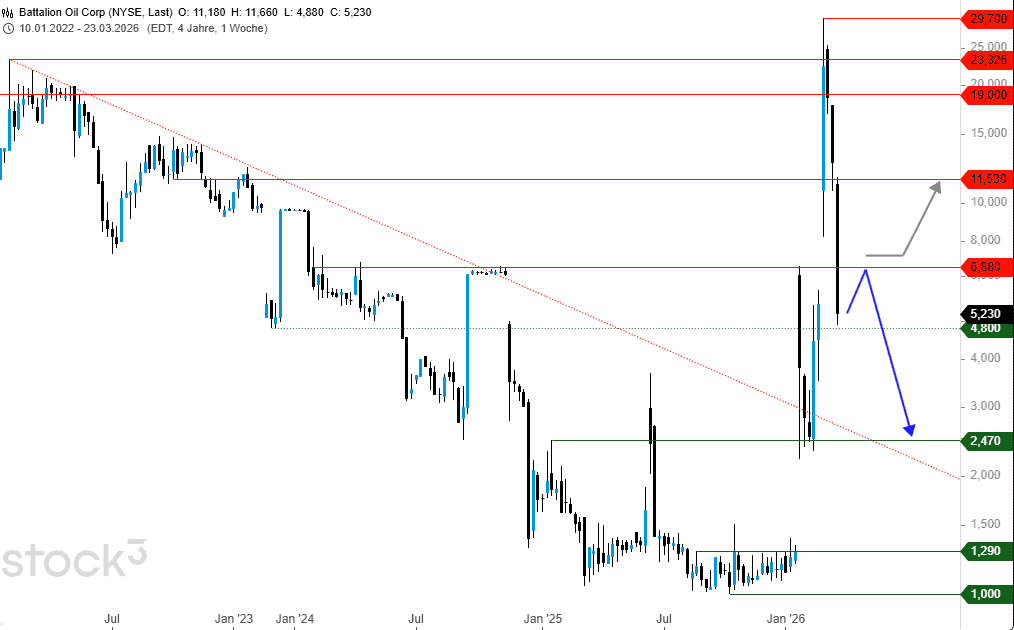 Anleger, die zu Jahresbeginn bei der Battalion Oil-Aktie zugriffen, konnten sich einer sagenhaften Rally-Bewegung erfreuen. Der spekulative Charakter sucht allerdings seinesgleichen, denn die Papiere befanden sich nahe der Allzeittiefs und im Ansatz einer möglichen Bodenbildung, welche sich letztlich äußerst explosiv mit mehr als +2.500% in der Spitze entlud. Jedoch sind allein seit Montag bereits wieder -58% an Abschlag zu verzeichnen.