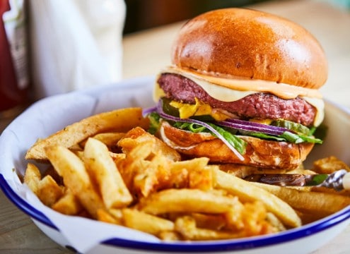 Ein veganer Beyond Meat-Burger mit ebenso veganen Pommes Frites...