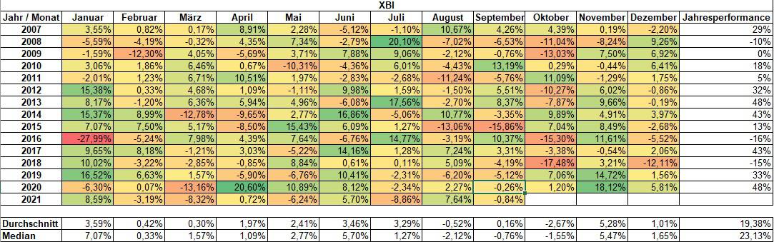 Wir haben den XBI zudem nach seiner Saisonalität analysiert und das Ergebnis fällt eindeutig aus: Der Zeitraum November bis Januar ist ganz klar ein tendenziell hervorragender Zeitrahmen gewesen, um in Biotech-Aktien investiert zu sein. Das hat auch damit zu tun, dass in dieser Zeit überdurchschnittlich viele wissenschaftliche Kongresse und Investorenkonferenzen stattfinden.