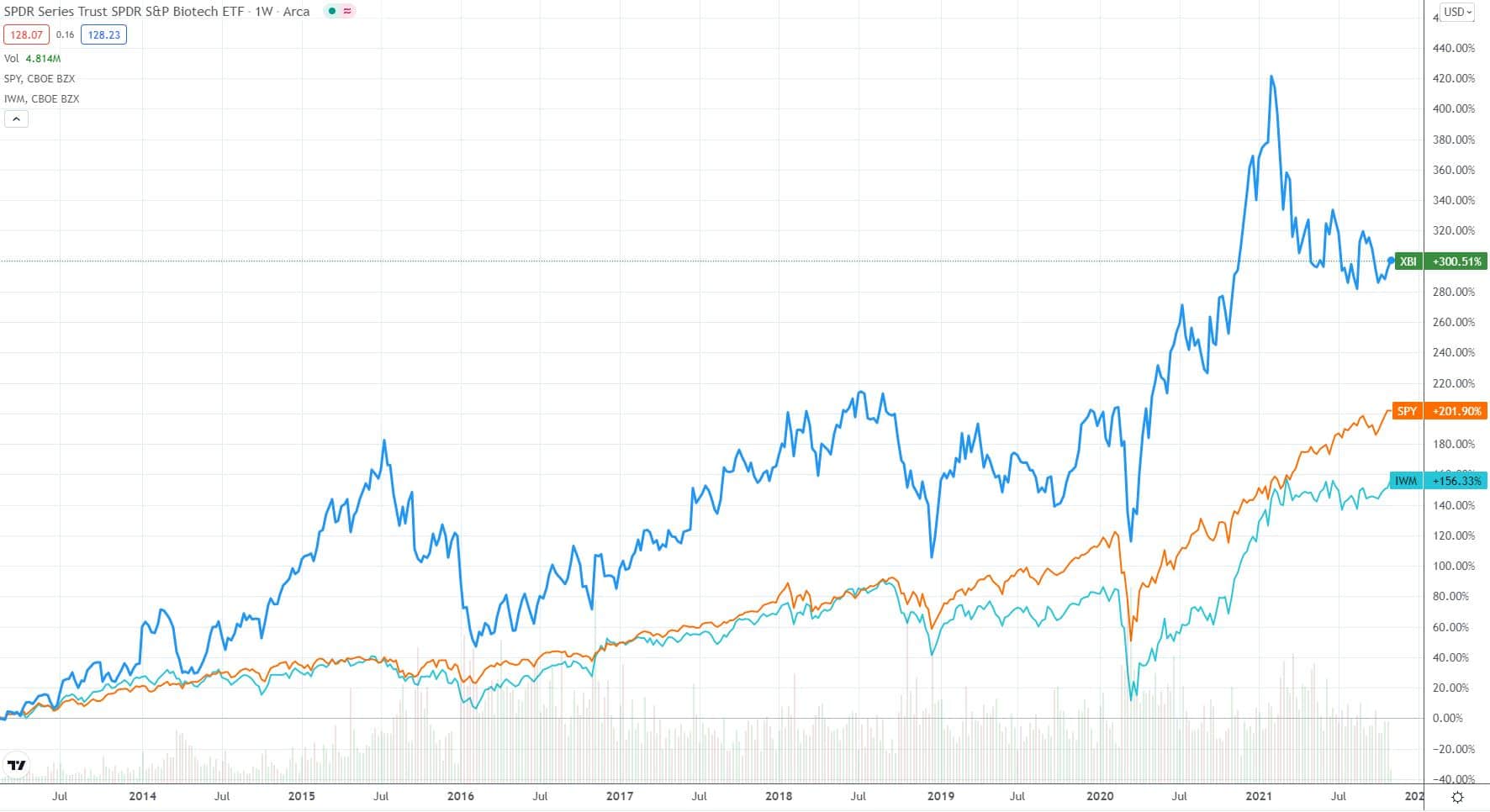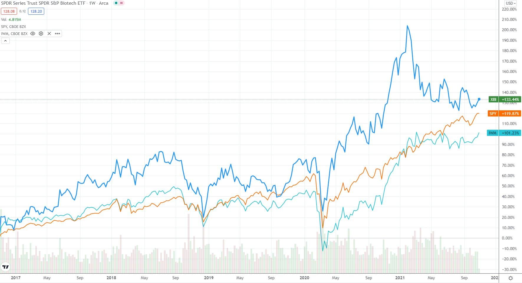 Kaum etwas wird derzeit so vernachlässigt und abgestraft wie der Biotech-Sektor. Nach einem fulminanten Jahresauftakt mit zahlreichen hohen Gewinnen wurde der Getränkeplan von Sekt auf Selters umgestellt. Die Katerstimmung sorgt für eine bedeutende Underperformance im Jahr 2021. Wir schauen uns einmal an: den XBI (Biotech-ETF), den IWM (Russell 2000 Small Cap-ETF) und den SPY (ETF auf den S&P 500).