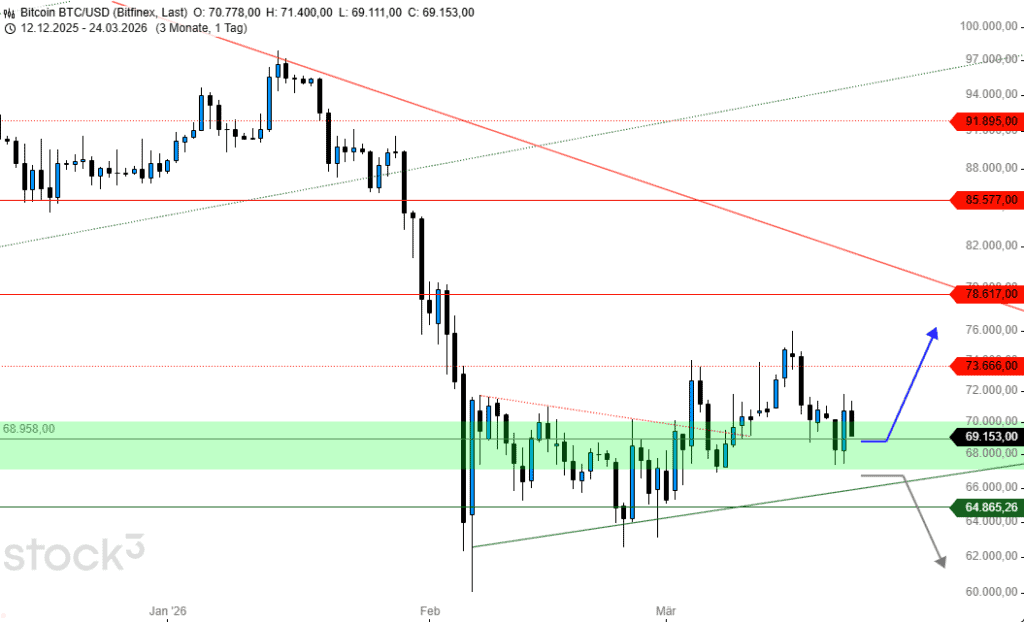 Die Ambitionen des Bitcoins schienen mit den stetig höheren Reaktionshochs seit dem Märzbeginn klar skizziert. Das Widerstandslevel von 78.620 US$ dabei fest im Blick, veränderte sich diese Perspektive dann doch schlagartig zum 18. März. Statt den Widerstand anzusteuern, setzte die Mutter aller Coins mit einem deutlichen Dämpfer in Richtung von 70.000 US$ zurück.