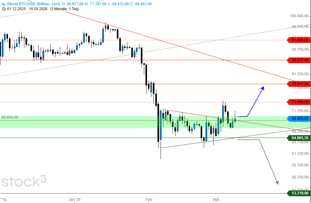 Idealerweise wird per Tagesschluss die Marke von 70.000 US$ überwunden, sodass sich weiterer Kaufdruck anschließen darf und die schwachen Hände als abgeschüttelt gelten.