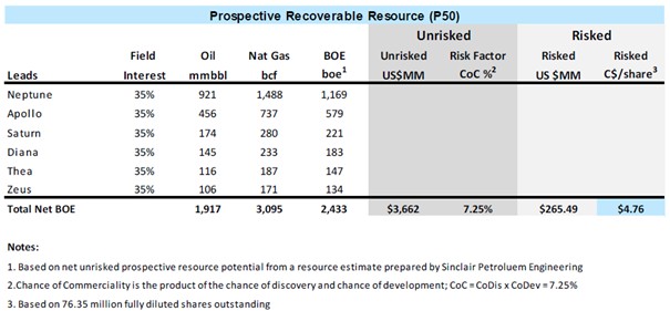 Auf Basis einer von Sinclair Petroleum erstellten Ressourcenschätzung kommt Granite Research auf einen risikoadjustierten Wert (7,25% Erfolgswahrscheinlichkeit) von 4,65 CA$ je Aktie: