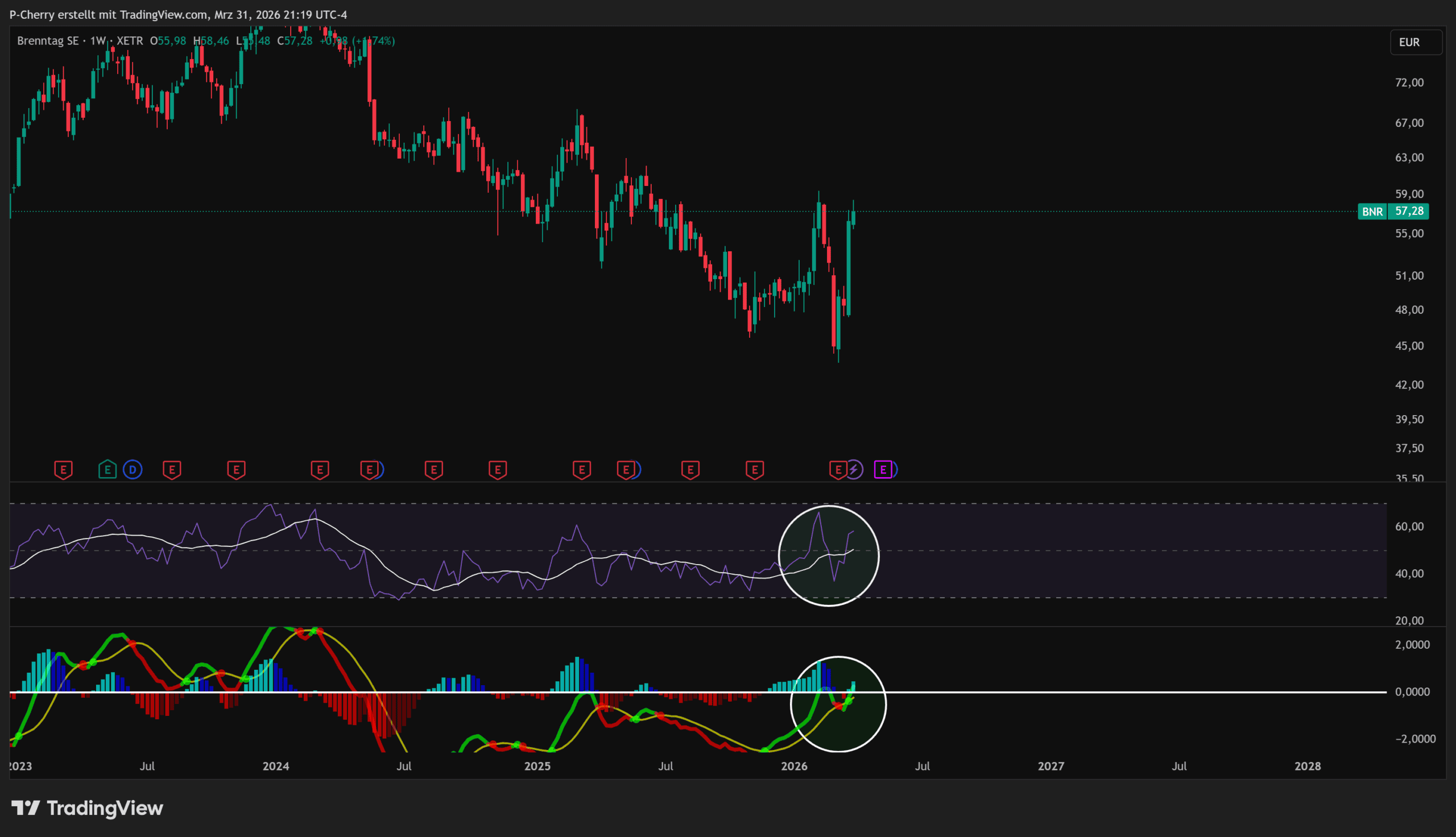 Die Indikatoren im Wochenchart wirken aktuell optimistisch. Der RSI und der MACD haben ein bullisches Crossover ausgebildet. Insgesamt hat der Brenntag-Kurs vom lokalen Hoch im Februar 2024 bei 87,12 € bis zum lokalen Tief -50% an Wert eingebüßt. Die bullischen Crossover sind nun ein erstes Indiz für einen bullischen Turnaround.