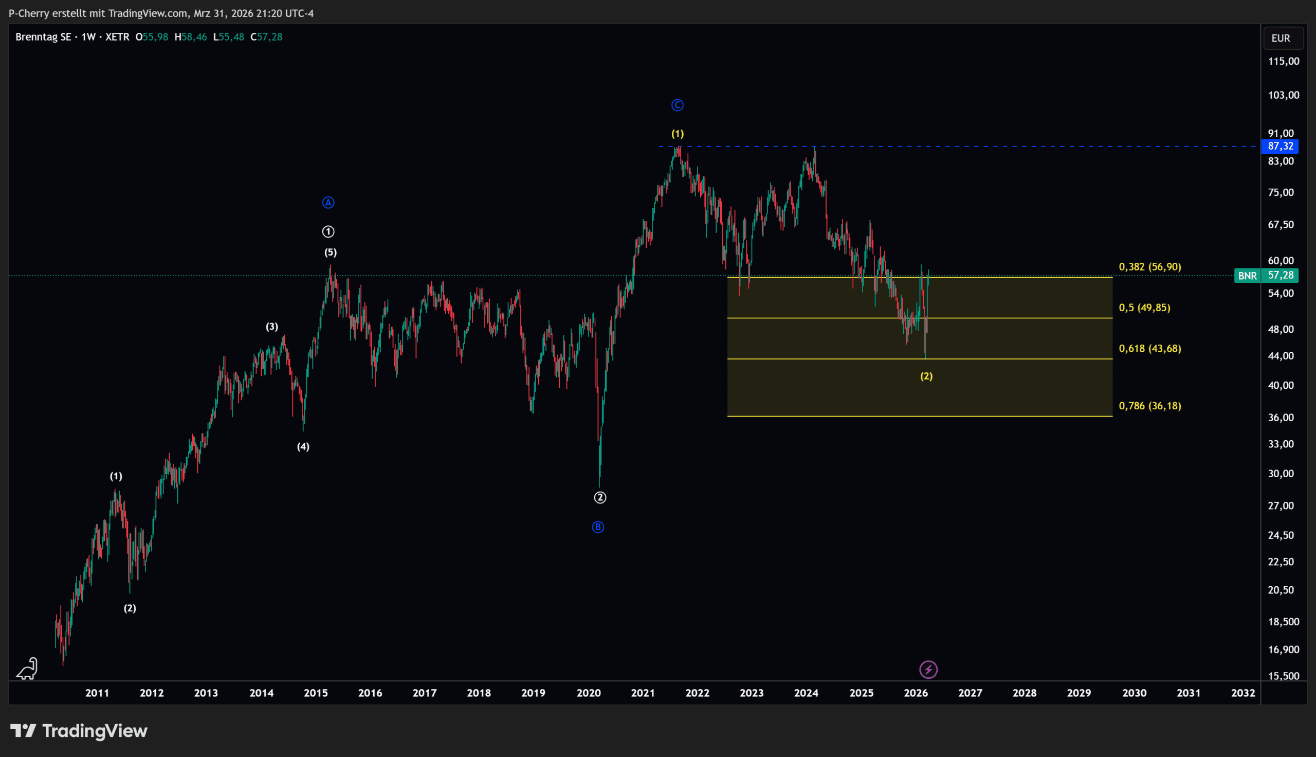 Die starke Reaktion auf den aktuellen Trendwendebereich am 0,618er Fibonacci-Retracement bei 43,68 € stützt die bullische These. Ein Ausbruch über das Welle 1-Hoch (siehe gelbe Zählung) bei 87,32 € bestätigt das bullische Szenario und führt gleichzeitig zu neuen Allzeithochs.