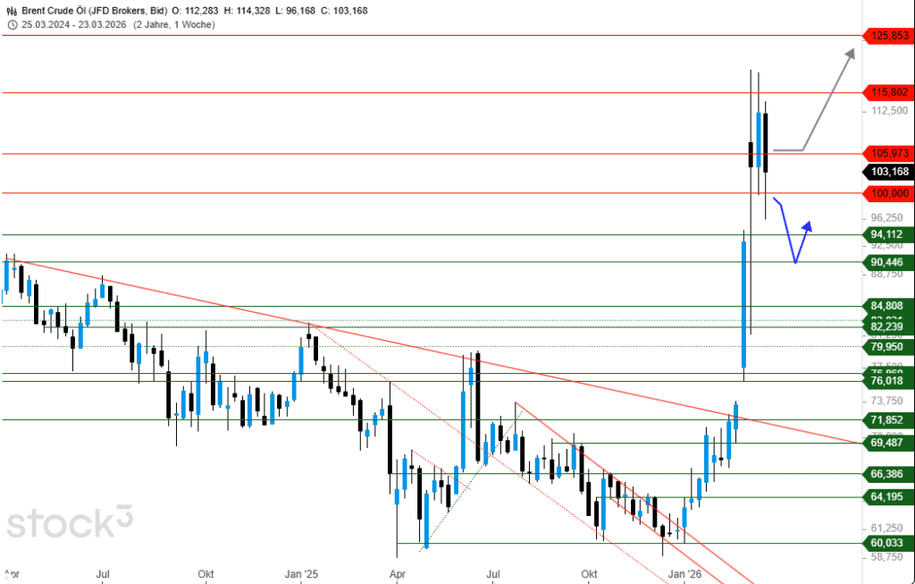 Eine schnelle Rückkehr über 105 US$ würde hingegen nochmalige Impulse in Richtung 112 US$ liefern. Oberhalb davon wiederum steigt die Wahrscheinlichkeit zur Einstellung des Widerstands von 115,80 US$, um damit weiteres Potenzial bis über 125 US$ in Aussicht zu stellen.