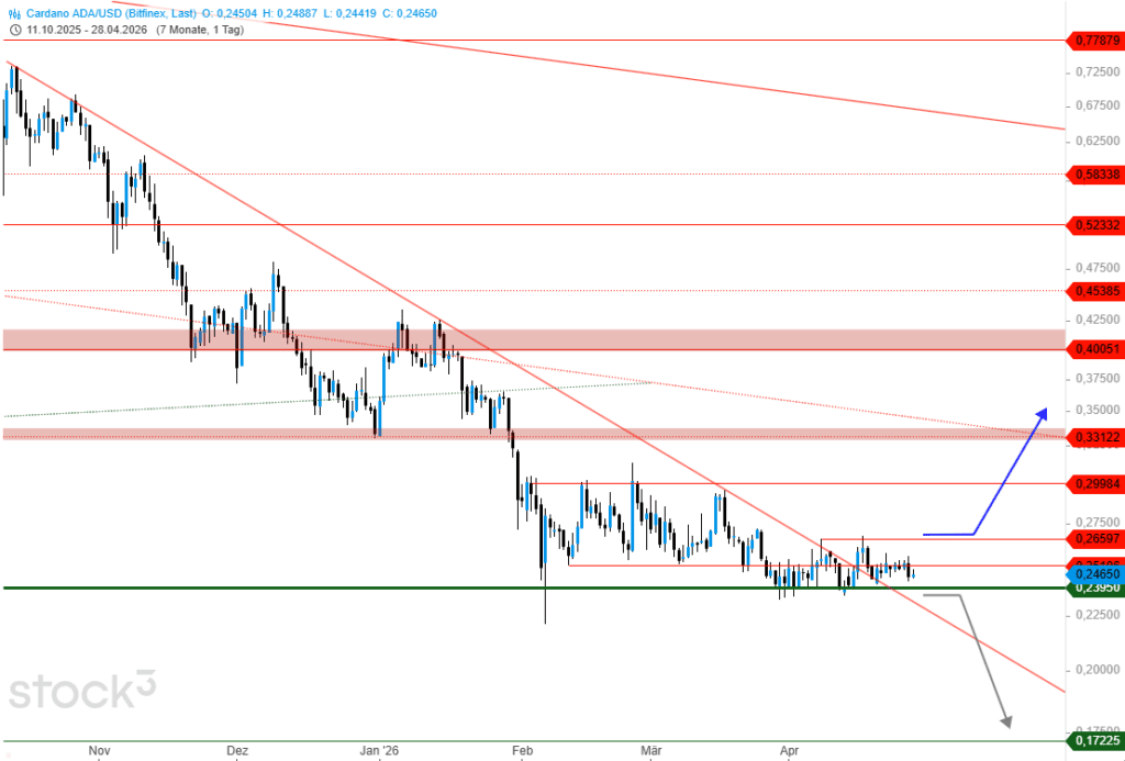 Aufgrund des letzten Bewegungshochs könnte es daher bei einem Sprung über 0,27 US$ zu einer Attacke auf 0,30 US$ kommen. Darüber würde der Kreuzwiderstand bei 0,33 US$ das weitere Interesse der Bullen wecken, sodass der ADA/USD endlich wieder das bisher eingetrübte Feuer erneut entfachen würde.