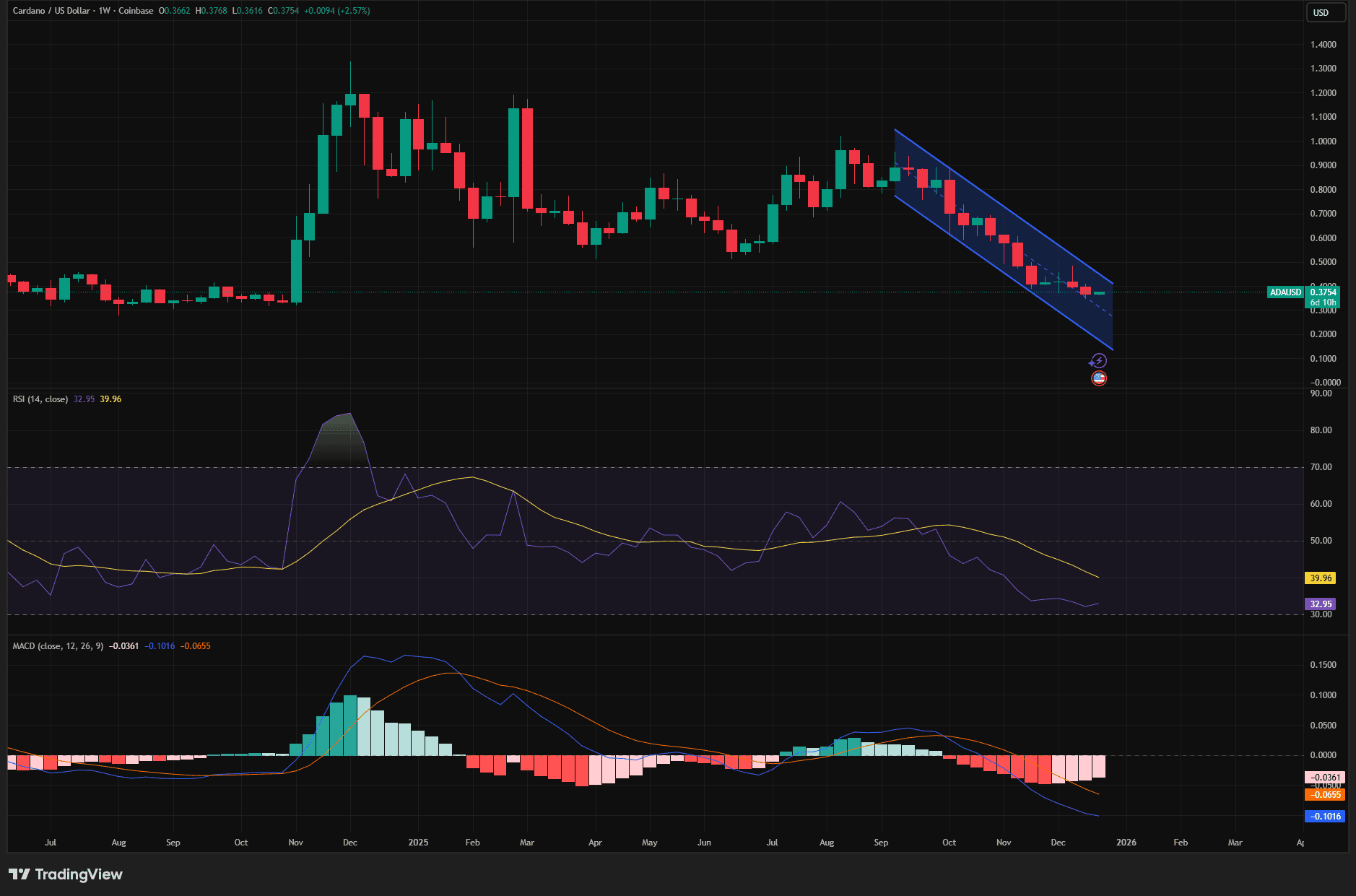 Cardano dümpelt weiter vor sich hin. Der Kurs bewegt sich seit Wochen in einem zähen Abwärtstrend und notiert nach leichter Erholung aktuell bei rund 0,37 US$. Ist die Kryptowährung in einer absteigenden Preisstruktur gefangen?